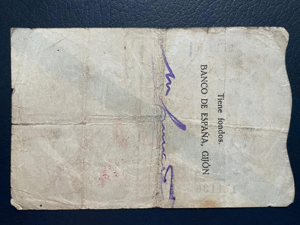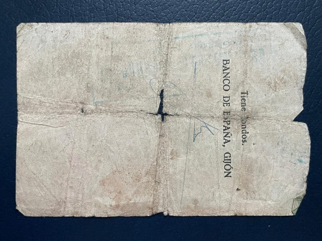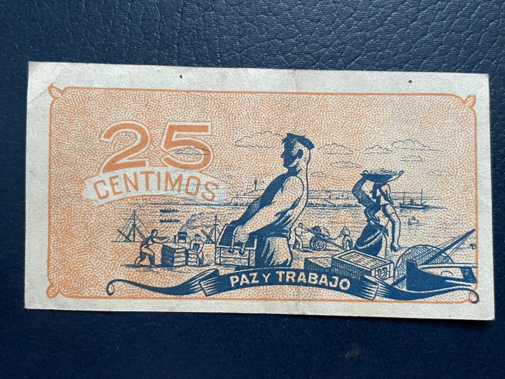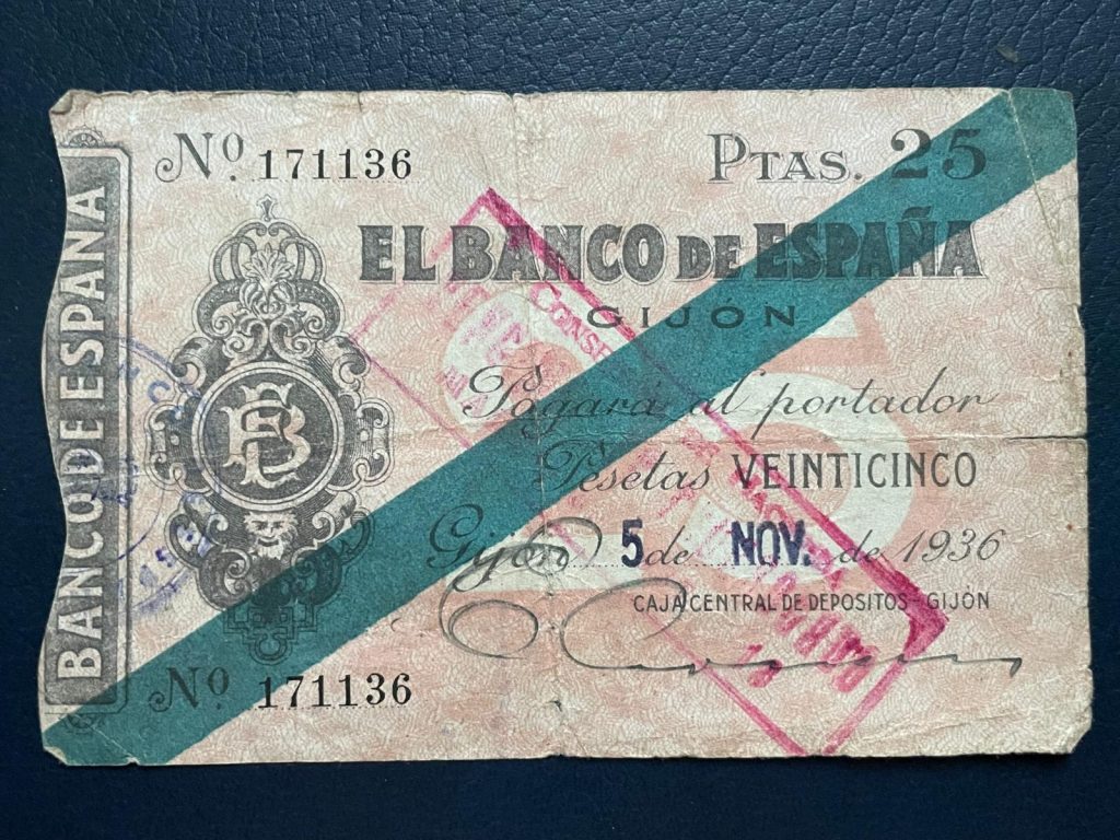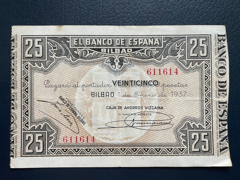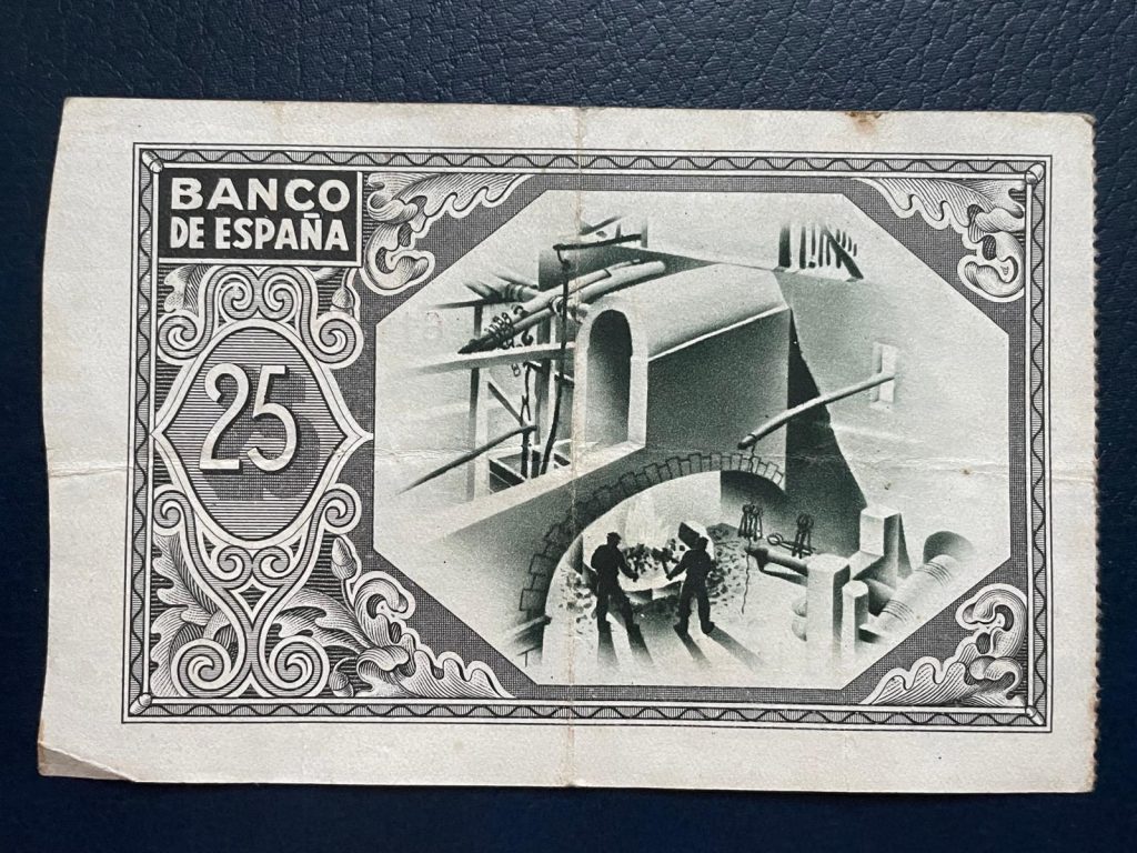 Billete de 25 pesetas del 1 de enero de 1937, Bilbao-Caja de ahorros de Vizcaya. Es un billete local de la Guerra Civil Española. Muestra en el reverso un taller de fundición de un alto horno. Durante la guerra civil quedaron aisladas las provincias del País Vasco, Santander y Asturias del resto de la zona republicana. Para proveer de moneda a la población Sucursales y Agencias del Banco de España emitieron vales, pagarés o talones al portador con el sello de banco correspondiente y la leyenda “Tiene fondos”, que circularon como billetes hasta que el Ejército Nacional ocupó Bilbao en junio de 1937.