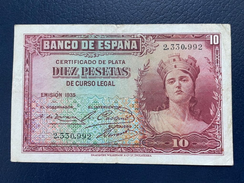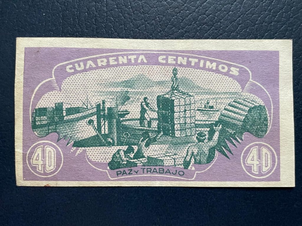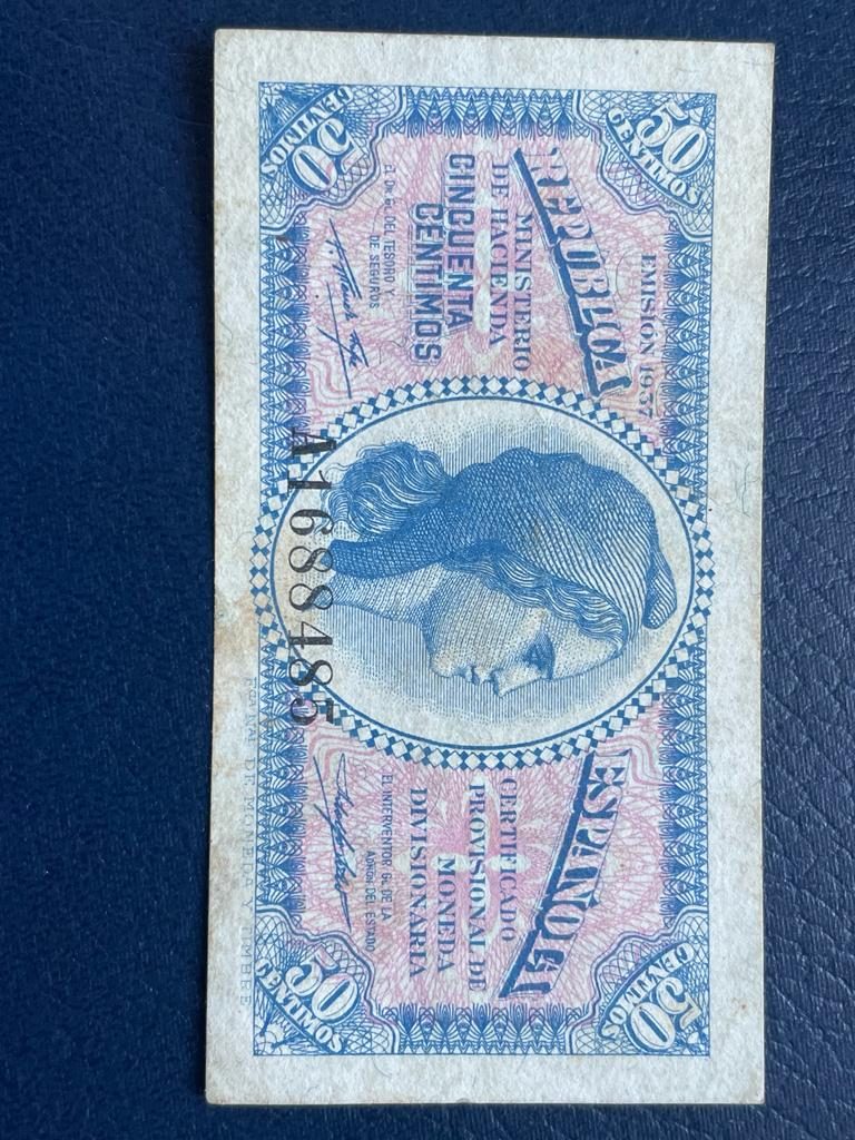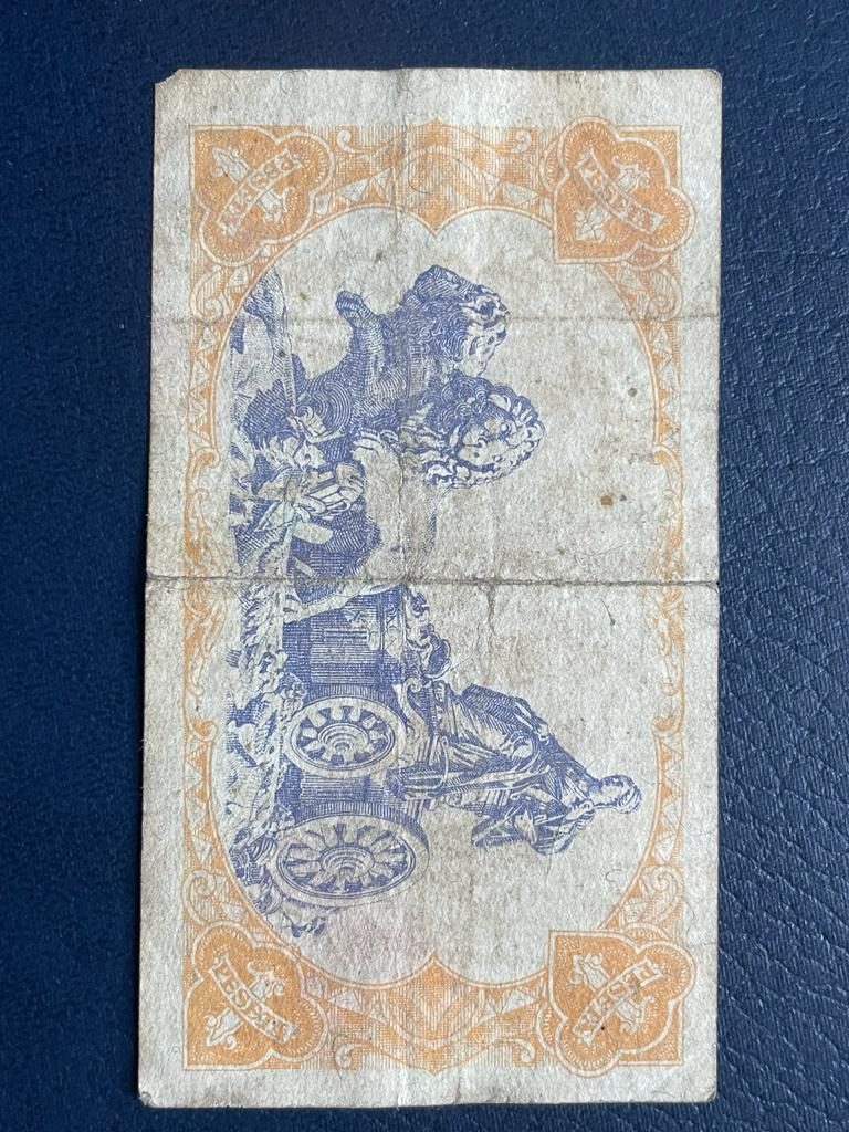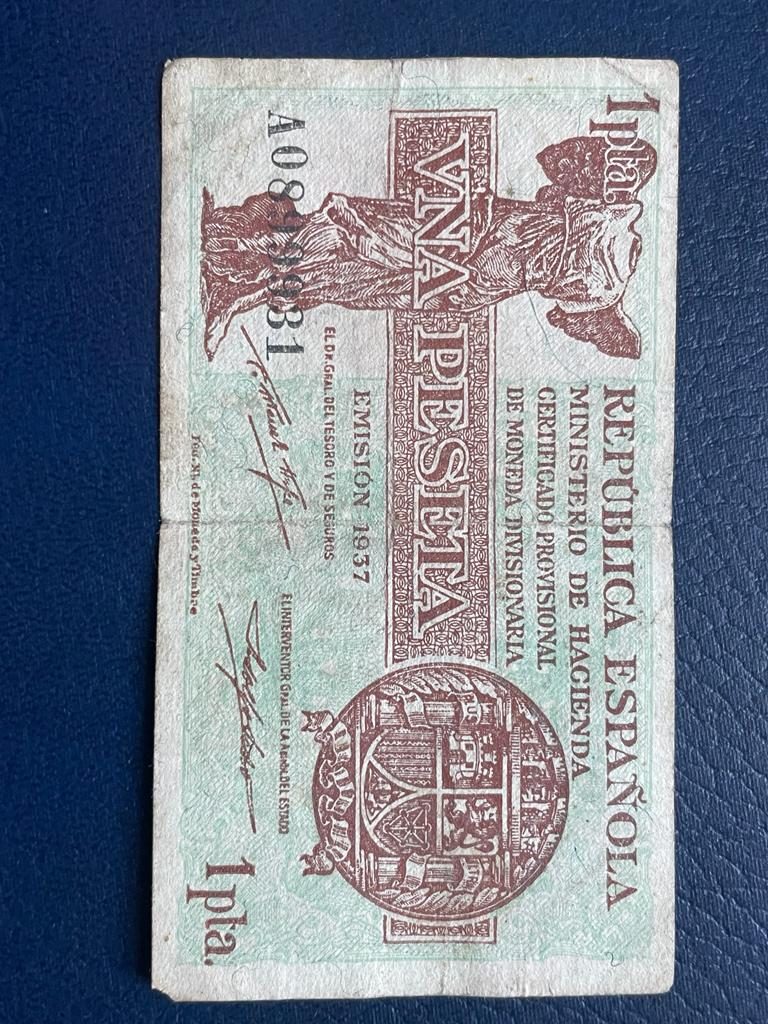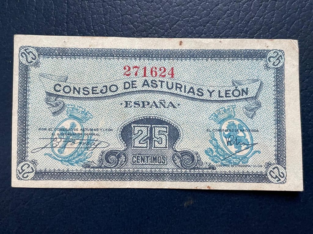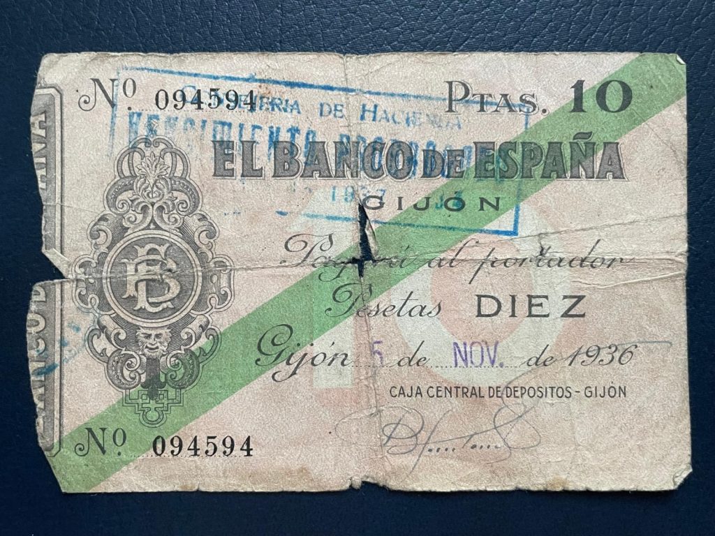 Billete de 25 pesetas del 1 de enero de 1937, Bilbao-Caja de ahorros de Vizcaya. Es un billete local de la Guerra Civil Española. Muestra en el reverso un taller de fundición de un alto horno. Durante la guerra civil quedaron aisladas las provincias del País Vasco, Santander y Asturias del resto de la zona republicana. Para proveer de moneda a la población Sucursales y Agencias del Banco de España emitieron vales, pagarés o talones al portador con el sello de banco correspondiente y la leyenda “Tiene fondos”, que circularon como billetes hasta que el Ejército Nacional ocupó Bilbao en junio de 1937.