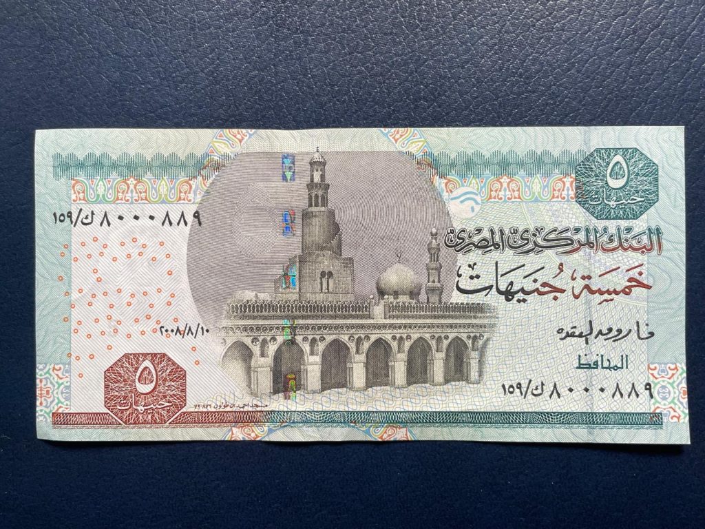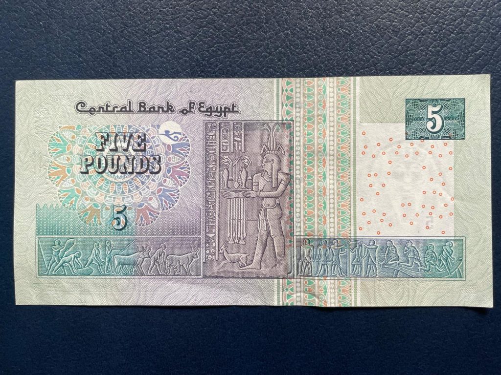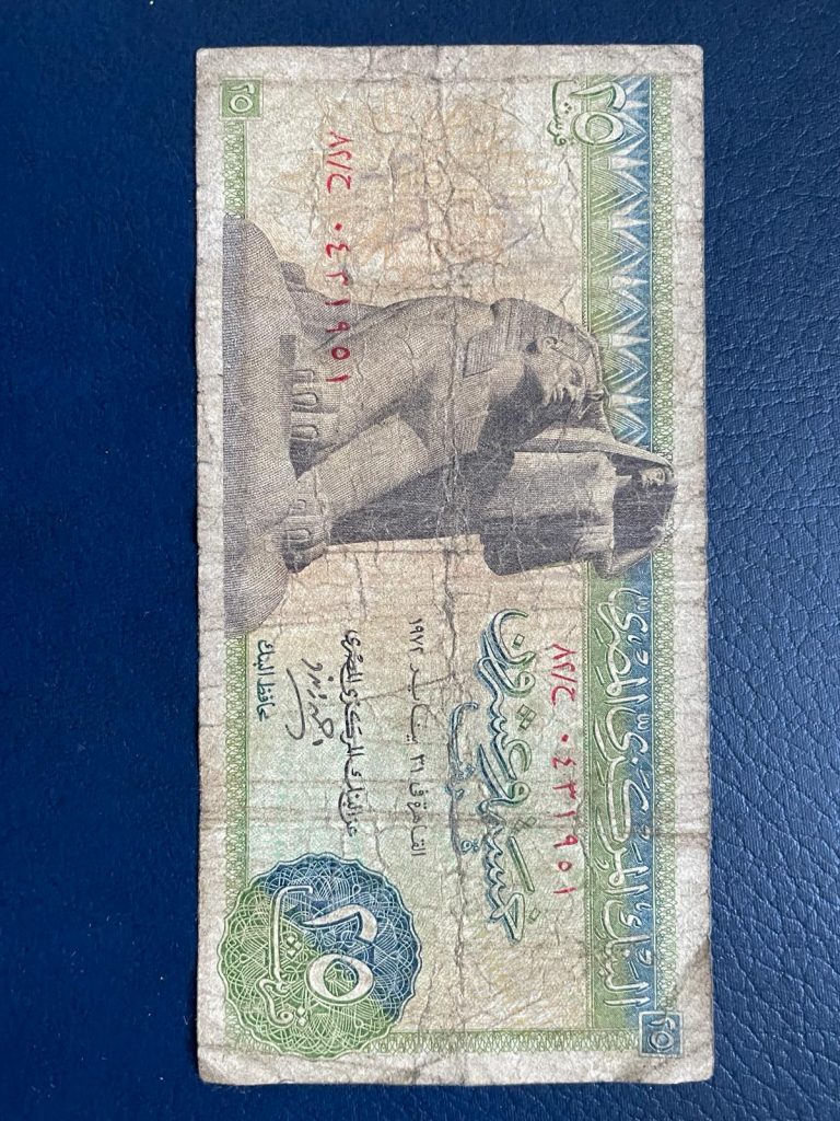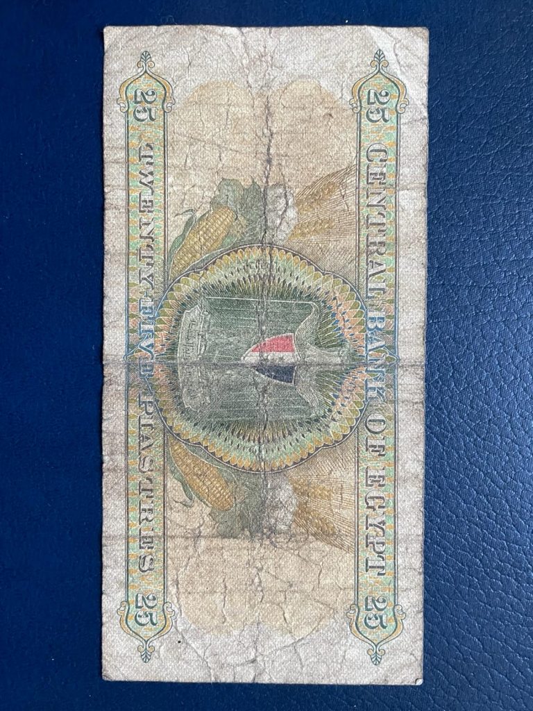 Los textos de todos los billetes egipcios están redactados en árabe con números arábigos orientales en el anverso y en inglés con números arábigos occidentales en el reverso (salvo de los que yo poseo, el de 10 piastras). Los diseños representan monumentos del antiguo Egipto en la cara escrita en inglés y mezquitas en la cara impresa en árabe.